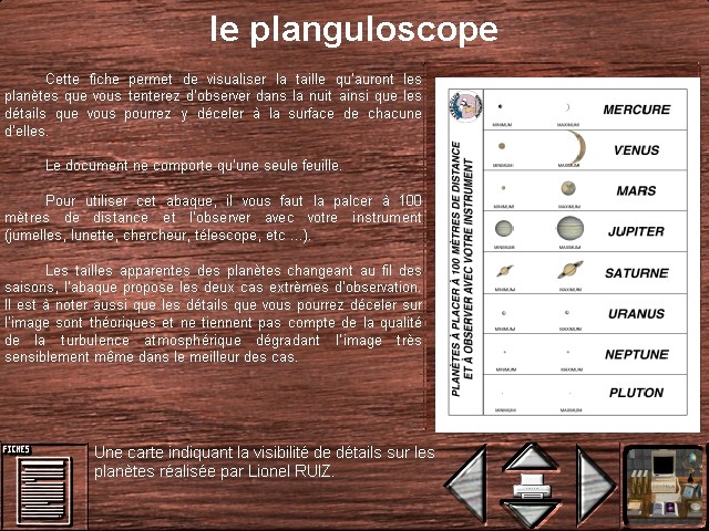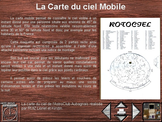 Les fiches sont des menus d'impression de feuilles permettant de réaliser des maquettes à découper et à monter. Sont réalisables grâce à Astrothèque: une carte du ciel mobile, un nocturlabe, une maquette sur les fuseaux, des cercles gradués pour molettes de montures 114/900...