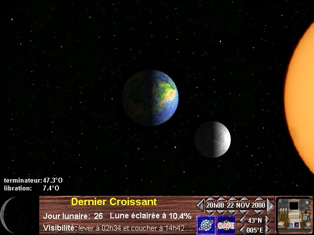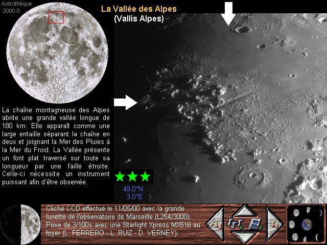 Cet atlas contient 100 détails, reliefs et mers lunaires rangés suivant leurs moments de visibilité. Il suffit de placer la souris sur un moment lunaire choisi ou de fixer la date pour pouvoir accéder aux reliefs qui seront observables au court de la soirée.